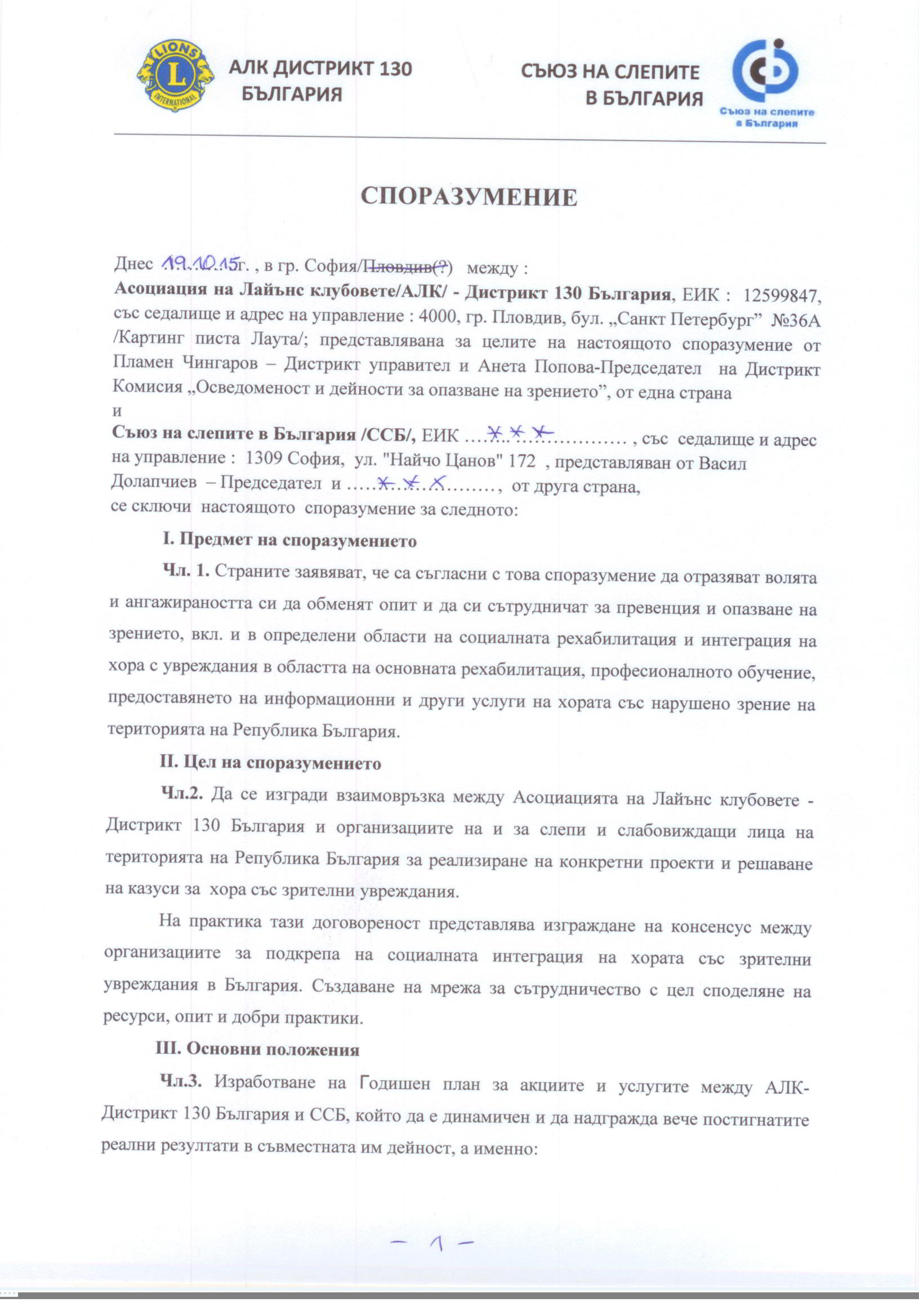 Споразумение Дистрикт 130 - Съюз на слепите - 1 стр.